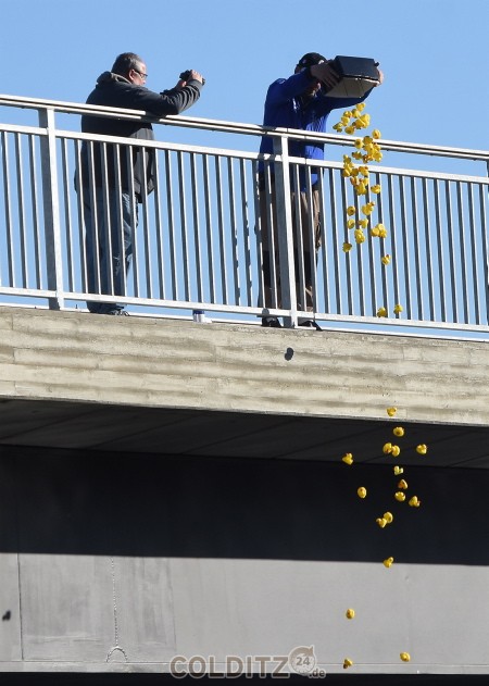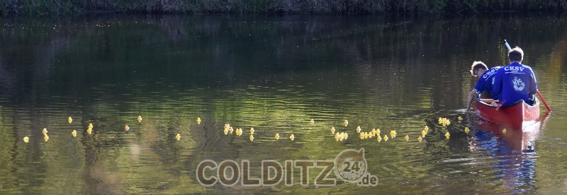 Dann rückte einer der Höhepunkte des Tages näher; das Entenrennen. 64 kleine Entlein stürzten sich aus luftiger Höhe ins Wasser und kämpften um die besten Plätze. Nachdem die Jungs vom Kanu-Klub die ersten und letzten Enten herausgefischt hatten, kam es zur Siegerehrung. Damit war die Muldenfestregatta aber noch längst nicht beendet. Ein gemütlicher Abend mit vielen Darbietungen stand bevor, um den Gästen ein abwechslungsreiches Programm zu bieten.
