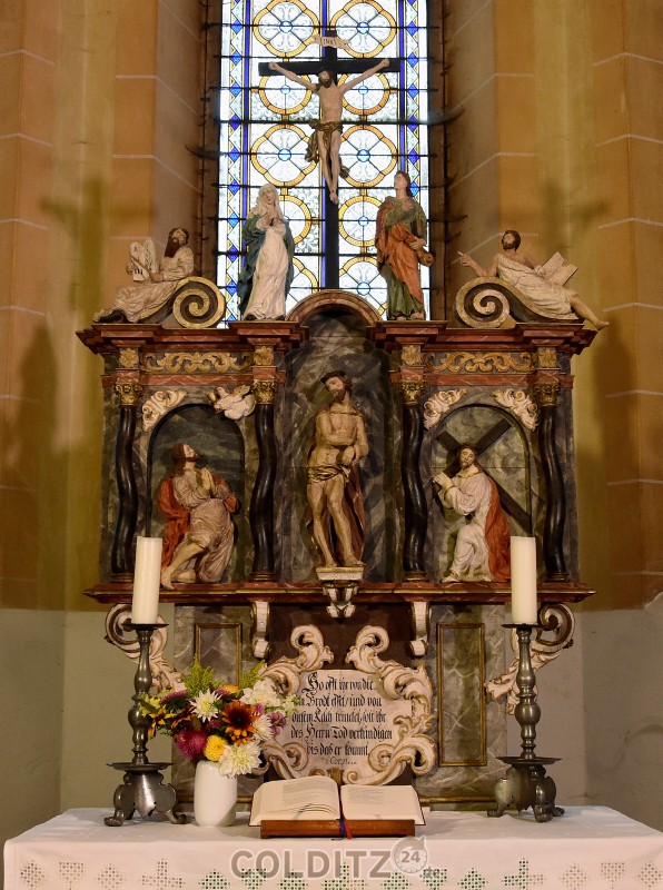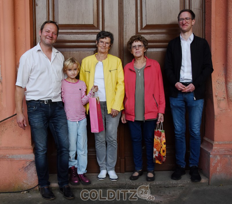 Am vergangenen Samstag füllte sich die Zschirlaer Kirche aus zweierlei Gründen; das alljährliche Erntedankfest und die Wiedereinweihung des Altars nach seiner Restaurierung. Die Kinder brachten die Erntekrone hereingetragen und stellten sie auf den Taufstein. Danach wurden die Kerzen und der Blumenschmuck vor den Altar gestellt. Als die Strahler den Altarraum erhellten, freuten sich alle Gäste über den herrlichen Anblick des restaurierten Altars.