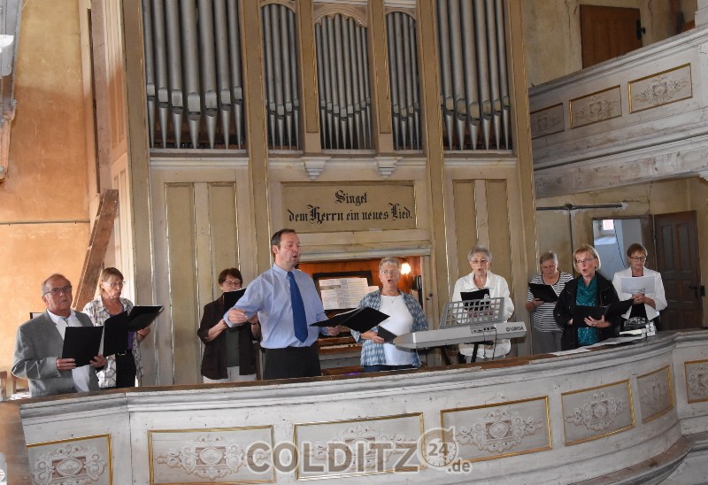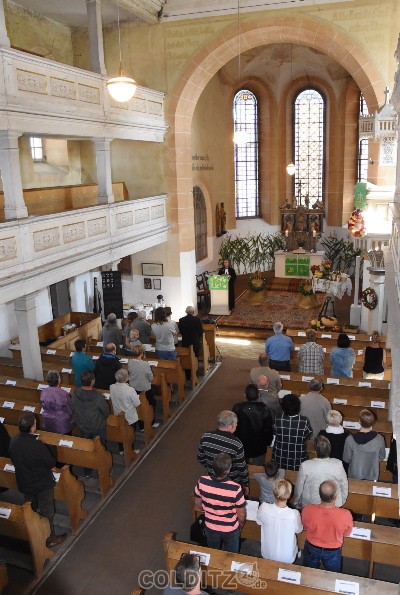 Der Gottesdienst begann mit einem Geläut der Kirchenglocken und dem anschließenden Zeremoniell des Erntedankfestes. Pfarrerin Angela Lau dankte in ihrer Predigt Gott, dass er uns auch in diesem Jahr eine reiche Ernte auf den Feldern und in den Gärten bescherte. Der Altarraum war entsprechend dieses Anlasses mit vielen Gaben geschmückt, zu zeigen, dass es uns doch gut geht und wir nicht klagen brauchen. Musikalisch wurde der Gottesdienst vom Kirchenchor Zschirla-Erlbach mit Kantor Mark Zocher umrahmt. Nach der Segnung ging es über in den 2. Teil des Anlasses dieser Zusammenkunft.