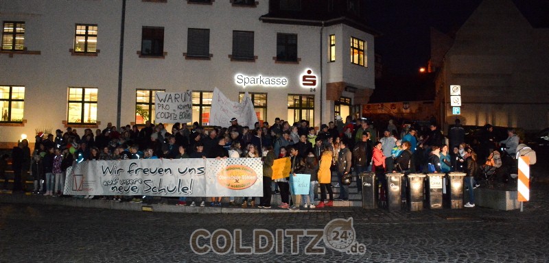 Heute 17.00 Uhr hatten über 150 Schüler, Eltern und Lehrer der Oberschule Böhlen vor der Colditzer Sparkasse Aufstellung genommen. Mit einer Art Mahnwache wollten sie ihre Abordnung unterstützen, die mit zwei Schüler- und zwei Elternsprechern eine Liste mit 3.300 Unterschriften FÜR DEN BAU einer neuen Oberschule in Böhlen dem Colditzer Bürgermeister Matthias Schmiedel übergab. Es sollte eigentlich in einer SR-Sitzung erfolgen, doch das wurde seitens des Colditzer BMs abgelehnt. Als eine gesittete Atmosphäre schätzten die Böhlener das Klima ein. Der Elternsprecher Sören Geiler-Weigt übergab die Petition. BM Schmiedel erläuterte die Geschichte, wie es überhaupt zu diesem Konflikt gekommen sei. Dem widersprach der Elternsprecher Konrad Hempel (auch Stadtrat in Grimma); die Realität sei etwas anders. Ein Kompromiss sei nicht gefunden worden. Julian Schaffranek appelierte zum Abschluss an die Vernunft des Colditzer Bürgermeisters und der Stadträte, die Klage abzuwenden und den Neubau zuzulassen.