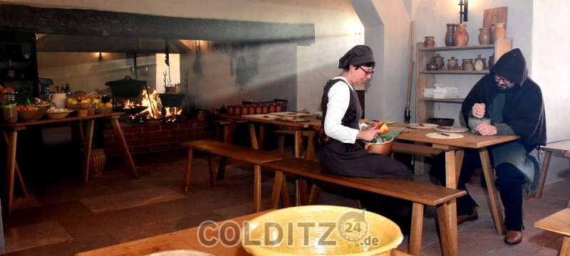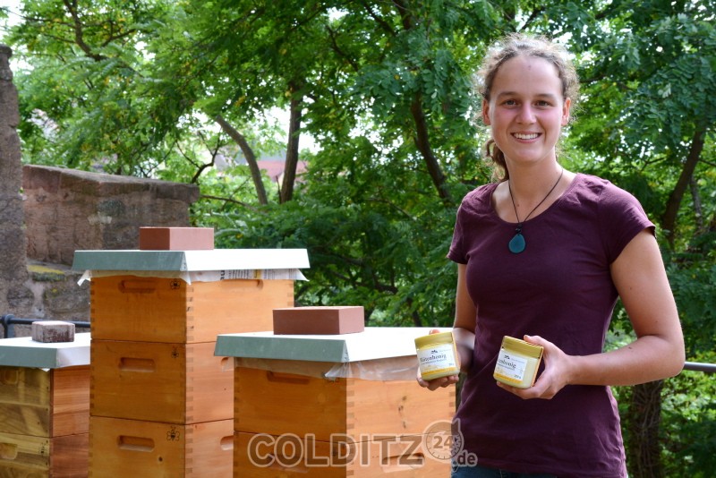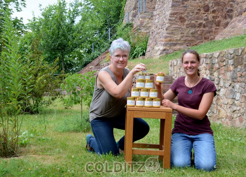 Planen sie eine außergewöhnliche Familienfeier oder mit Ihren Arbeitsteam ein paar unvergessliche Stunden, so melden Sie sich in der Burg und stimmen Termin und Wünsche miteinander ab – das Burgteam geht gern auf Ihre Wünsche ein, denn es soll bei Ihnen ja in bester Erinnerung bleiben. Apropos Erinnerung – jeder Besucher nimmt sich dort, wo es ihm gefallen hat, auch gern ein Souvenir mit. Eigentlich war an die Herstellung von Met, den Honigwein gedacht. Honig wurde ja schon vor Jahrhunderten zum Versüßen von Speisen verwendet, gehörte auf jede Tafel. Aber woher sollte man den hier in Leisnig bekommen? Die Kontakte zum Leisniger Imkerverein brachten die Lösung – die junge Imkerin Paula Schiller hat in die Außenanlage der Burg Mildenstein drei Bienstöcke gestellt, woraus die fleißigen Bienen nun ausschwärmen, um den Nektar einzu- sammeln. Die 21jährige hat sich ihr Wissen bei anderen Imkern angeeignet, ist mit ihnen parallel gelaufen und konnte sich nun vor einem Jahr selbstständig machen. Die Zeit ist vergangen, mit dem Schleudern konnte begonnen werden. Nun wurde der köstlich Blütenhonig abgefüllt und kann im Souvenirshop der Burg Mildenstein erworben werden. Da es hier nicht um ein Massenprodukt handelt, ist die Auflage limitiert – also schnellstens zugreifen, wenn Sie Appetit darauf haben. Über so ein außergewöhnliches Souvenir mit speziellem Etikett der Burg Mildenstein freut sich auch Britta Köpke, die die ersten Gläser in Empfang nehmen konnte.